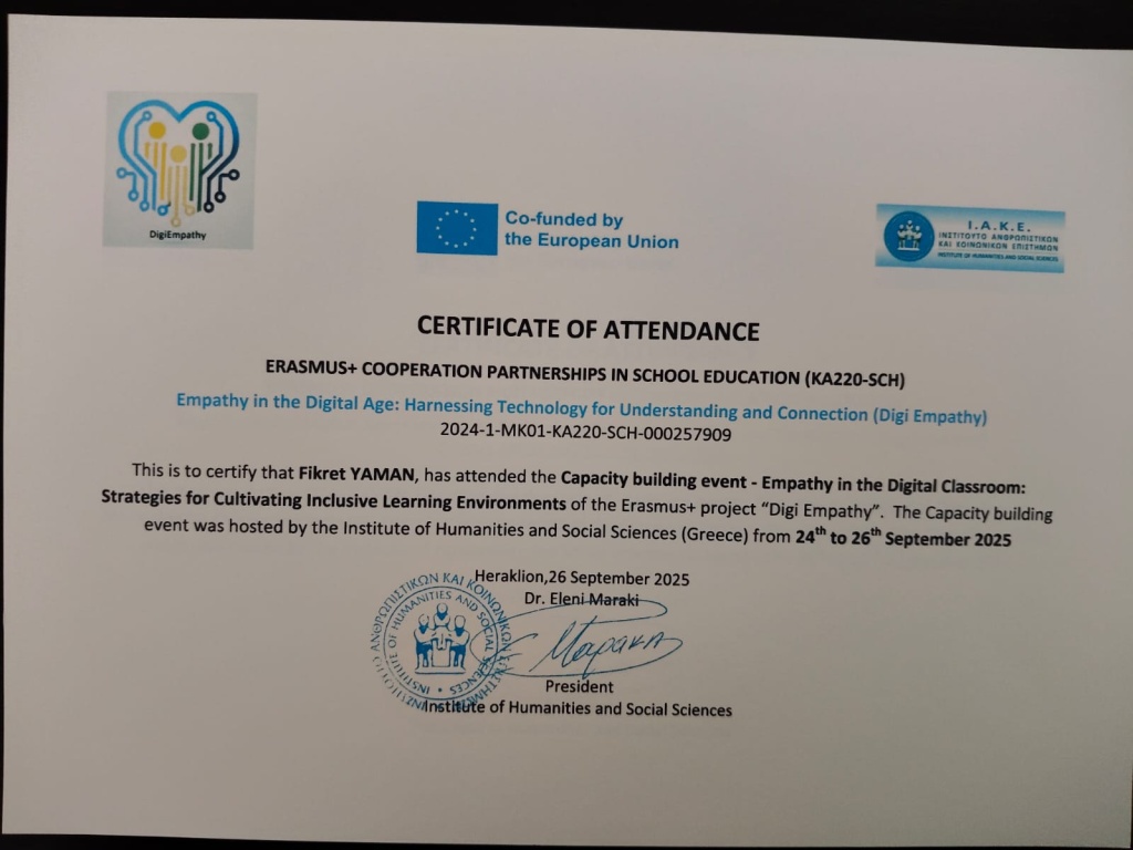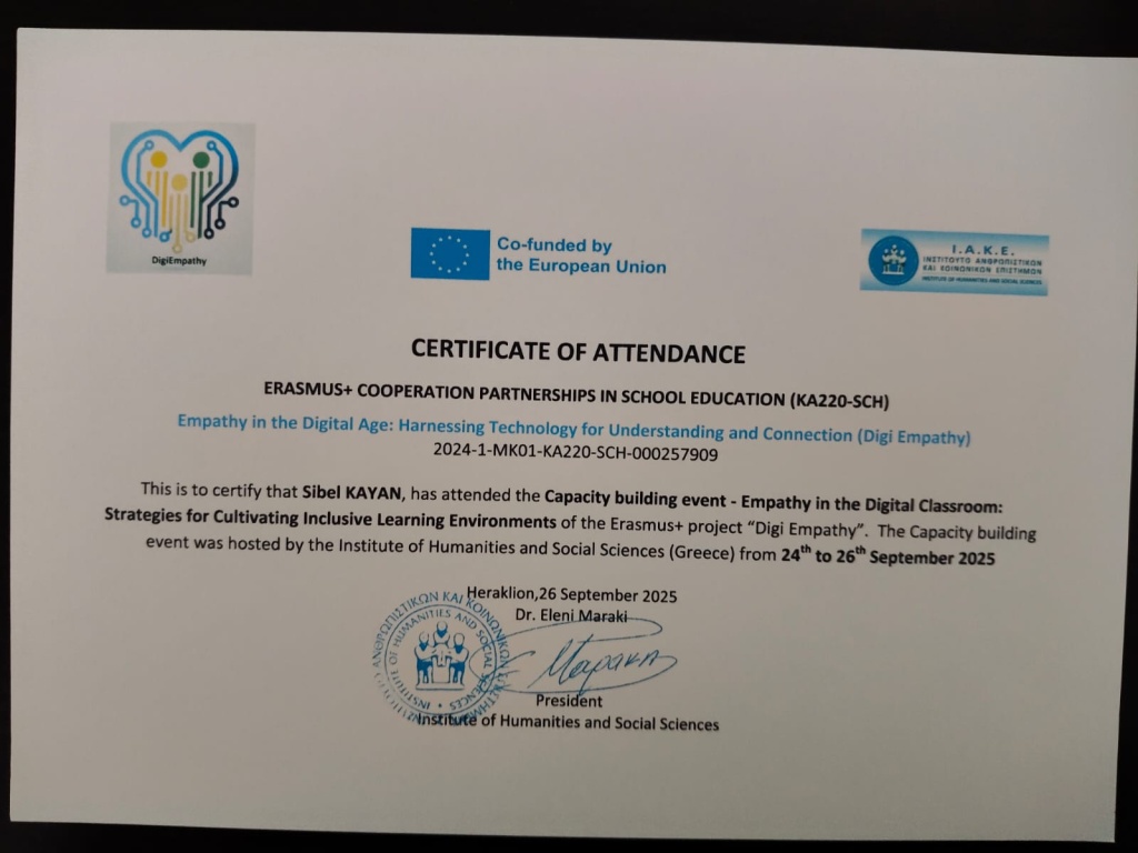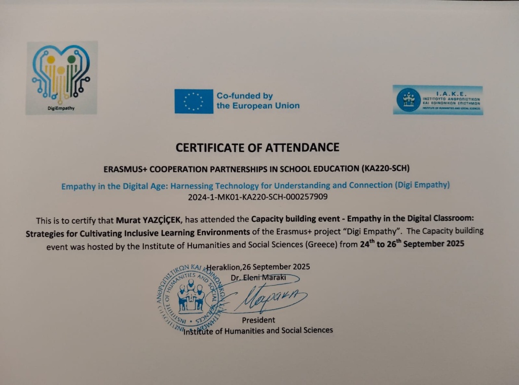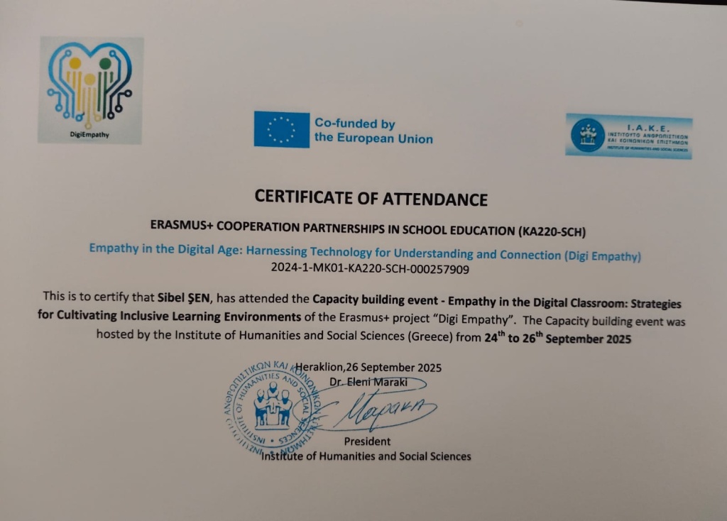Kızılcahamam Anadolu Lisesi olarak Okul Müdürü Sibel ŞEN, Okul Proje Koordinatörü Murat YAZÇİÇEK, Okul Proje Ekibinden Fikret YAMAN ve Sibel KAYAN'ın katılımıyla 23-27 Eylül 2025 tarihleri arasında "2024 Erasmus+ KA220-SCH-Digi Empathy-Empathy in the Digital Age: Harnessing Technology for Understanding and Connection" projesi için Yunanistan'ın Girit Adasın'da Beşeri ve Sosyal Bilimler Enstitüsü'nde(I.A.K.E)gerçekleştirdiğimiz "Dijital Sınıfta Empati Konferansında" bulunma imkanı yakaladık. Üç günlük konferansın her günü dolu dolu geçti. Yapay zeka, öğrenmenin kişileştirilmesi ve dijital teknolojilerde etik uygulaması konulu etkileşimlerde bulunduk. Kahoot, Canva, Mentimeter, Chat Gpt gibi yapay zeka araçlarıyla çalıştığımız interaktif atölye çalışmalarının çok faydası oldu. Bu deneyimler bize modern teknolojilerin öğrencilerin daha fazla kapsayıcı ve motivasyona nasıl katkı verebileceğini gösterdi. Kızılcahamam Anadolu Lisesi olarak başta Kuzey Makedonya, Portekiz, Çek Cumhuriyeti, Yunanistan ve Samsun İl MEM'den proje ortaklarımıza, bizleri çok iyi ağırlayan Jenny Psaltaki'ye, konferans sunumlarını yapan Dr. Leonidas Chalkiadakis, Dr. Habil Yan Kapranov, Fotis Kolokotronis ve Emmanouil Dialynas'a çok teşekkür ederiz. Seneye Ankara'daki Konferansımızda buluşmak üzere....