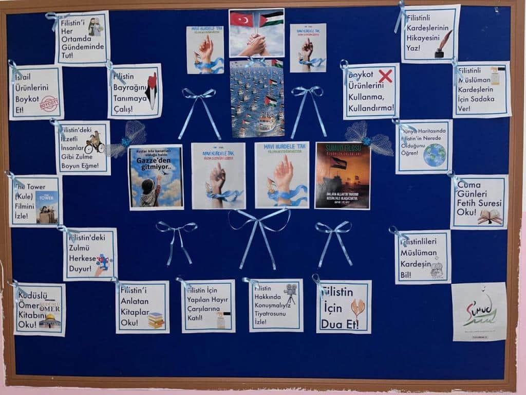 hep beraber “Gazze İçin El Ele” dediler. Mavi bileklikleri ve dualar eşliğinde barış zinciri oluşturdular, okul panolarımızda “ Gazze, Kudüs ve Küresel Sumud Filosu “ hakkında bilgilendirmeler yapıldı.